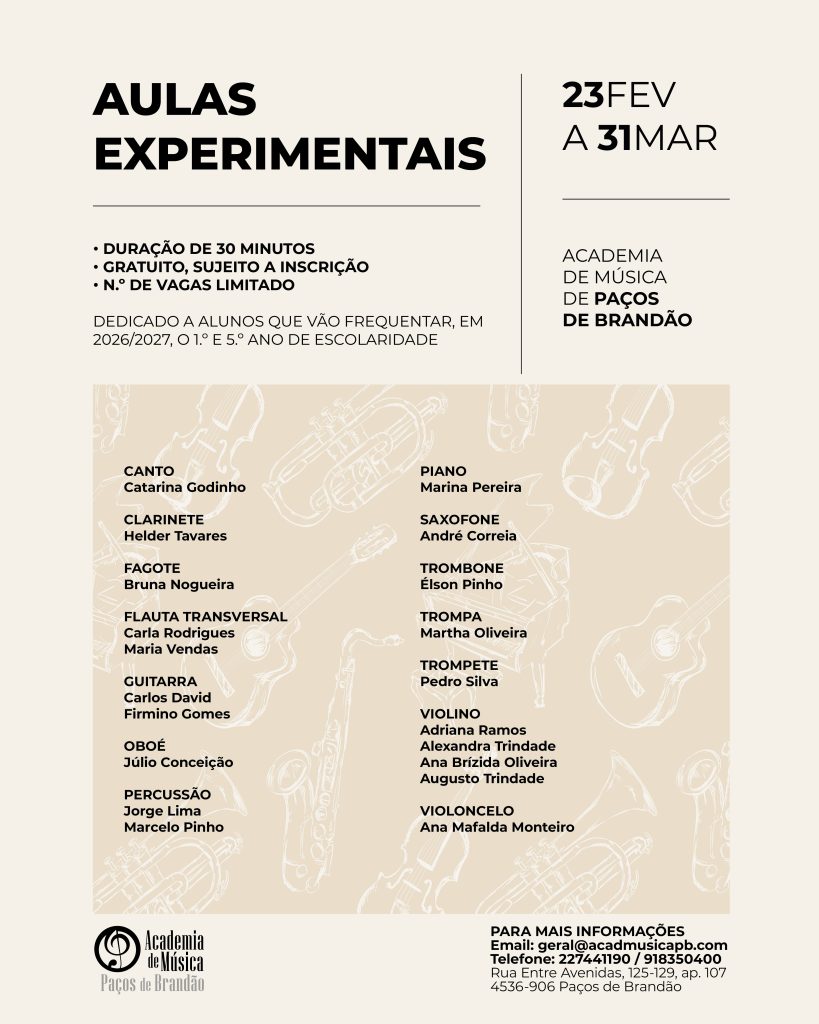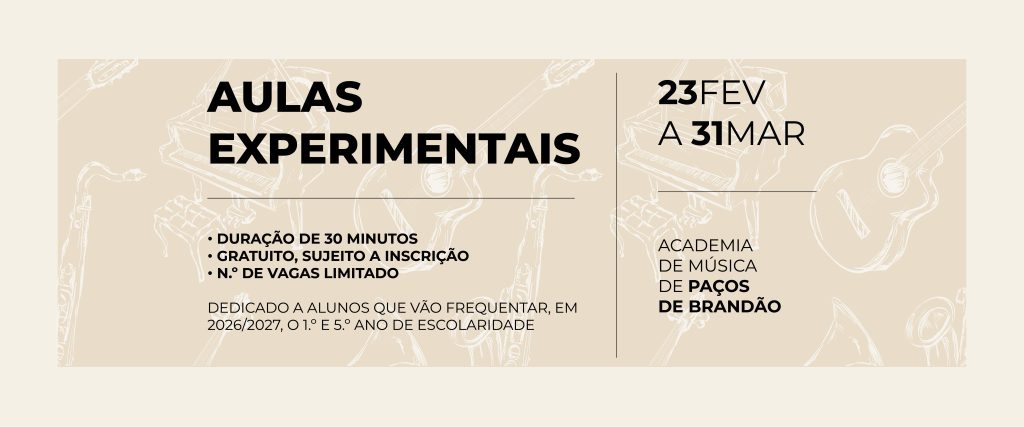 AULAS EXPERIMENTAIS23 de fevereiro a 31 de março 2026 Duração de 30 minutosGratuito, sujeito a inscriçãoN.º de vagas limitado Dedicado a alunos que vão frequentar, em 2026/2027, o 1.º e 5.º ano de escolaridade. Link para inscrição aqui